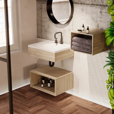 Mueble soporte Godai, diseño elevado que ayuda a evitar humedades. Crea espacios increíbles combinando tu mueble Godai con los lavamanos Firplak de 63x48cm y con sus diferentes elementos: Cubo y Cajón.