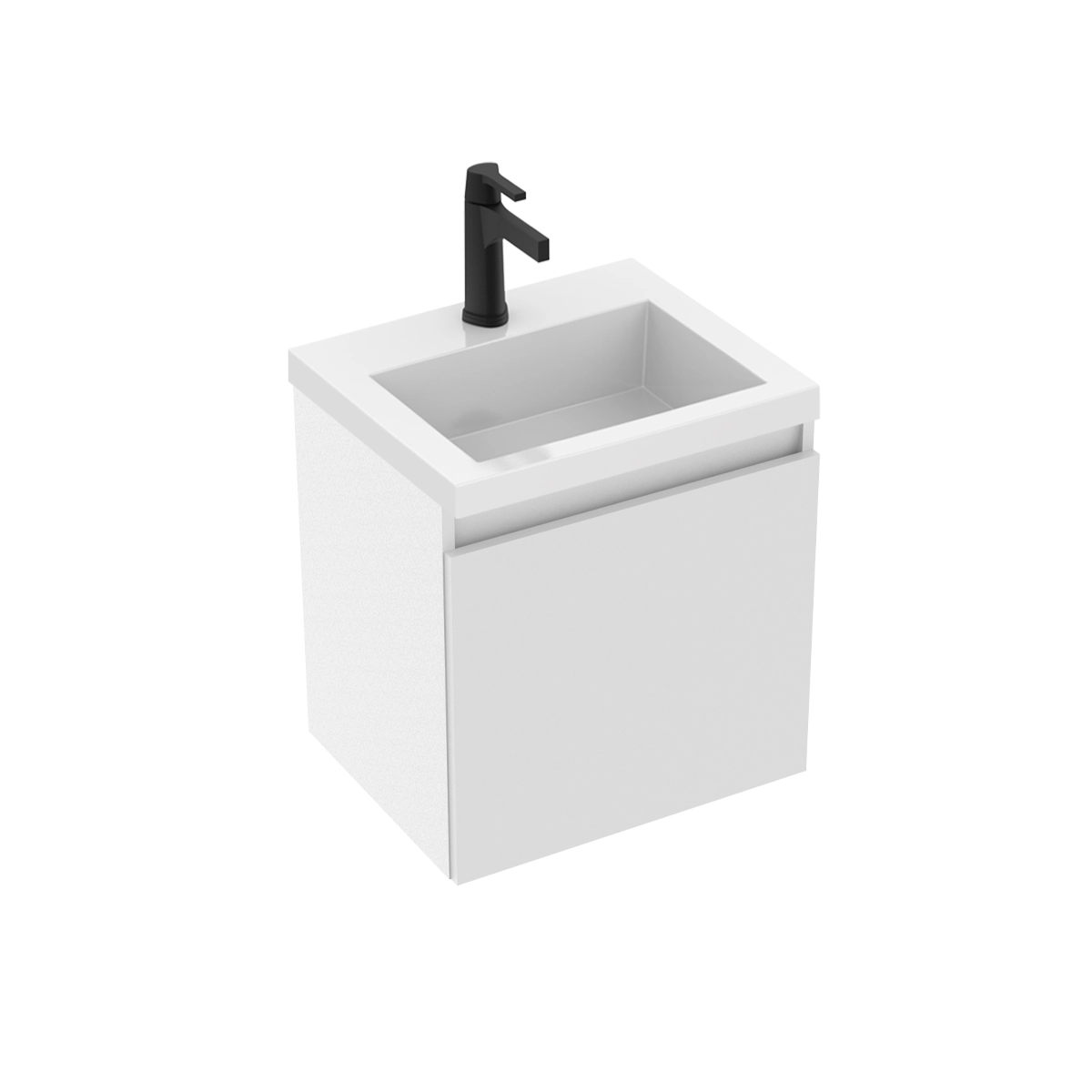 Mueble Básico elevado sin manija en complemento con el nuevo lavamanos OSLO de 48x38cm, tipo vanity y elaborado en mármol sintético, mantendrán la estética y el orden que su hogar se merece. Ideal para espacios pequeños.