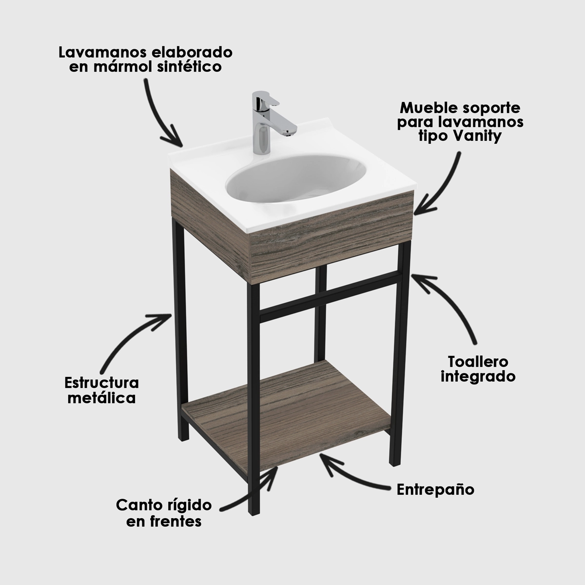 Combinación perfecta de diversos materiales para resaltar tu baño, estructura color negro en acero, en contraste con mueble y lavamanos tipo vanity con diseño moderno de líneas rectas. Crea espacios increíbles combinando tu mueble Godai con sus diferentes elementos.