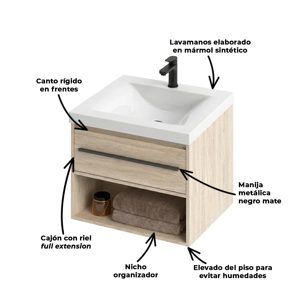 Lavamanos Siena tipo vanity, elaborado en mármol sintético de apariencia brillante y diseño minimalista con líneas curvas, espacios limpios y estéticos gracias a su mesón integrado. Mueble Picasso elevado, contiene cajón con compartimentos, riel full extensión, manija metálica en color negro mate y un nicho organizador con amplio espacio de almacenamiento.