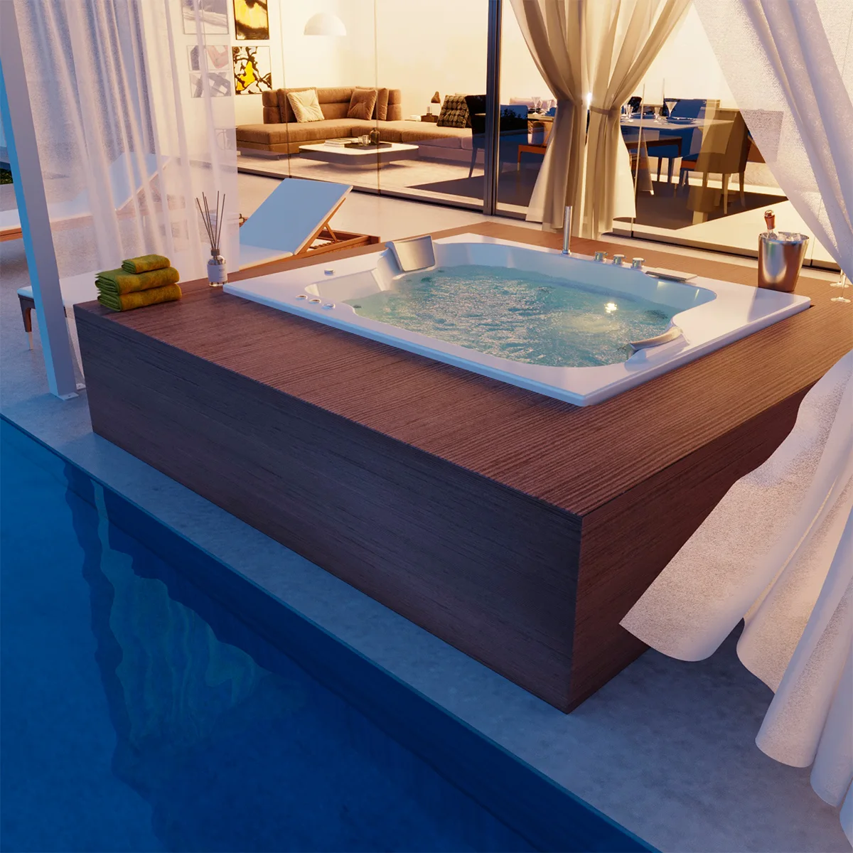 Jacuzzi de empotrar ideal para dos personas, diseño ergonómico con 10 potentes jets para realizar masajes en las principales zonas musculares del cuerpo. Vive la mejor experiencia de relajación y descanso con tu Spa en casa. Su diseño permite una fácil instalación sobre mampostería, piedra o madera.