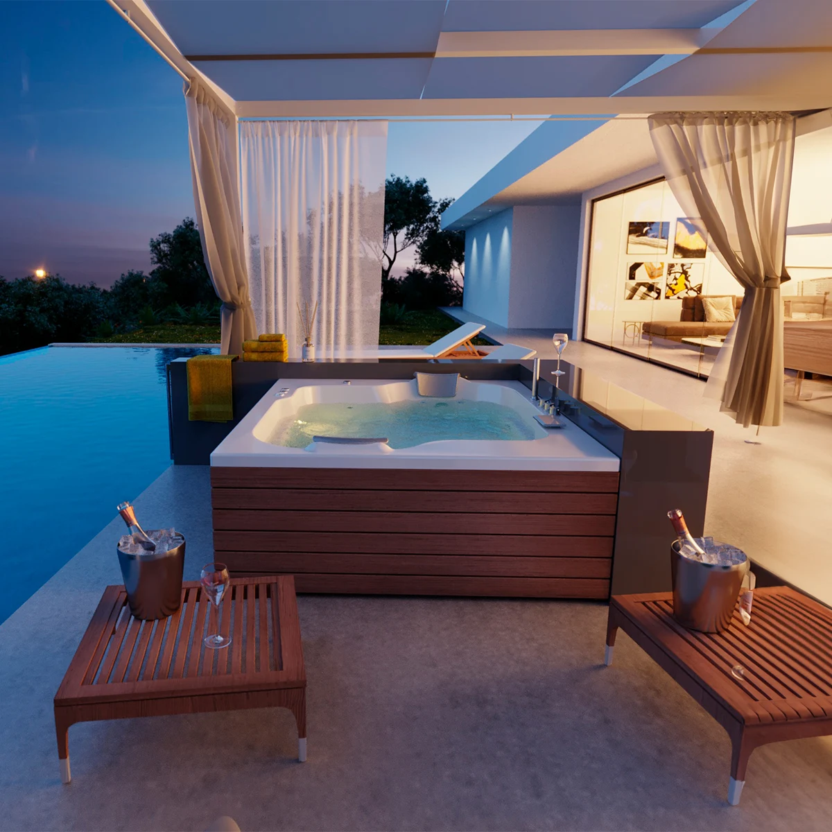 Jacuzzi portátil ideal para dos personas, diseño ergonómico con 10 potentes jets para realizar masajes en las principales zonas musculares del cuerpo. Vive la mejor experiencia de relajación y descanso con tu Spa en casa.