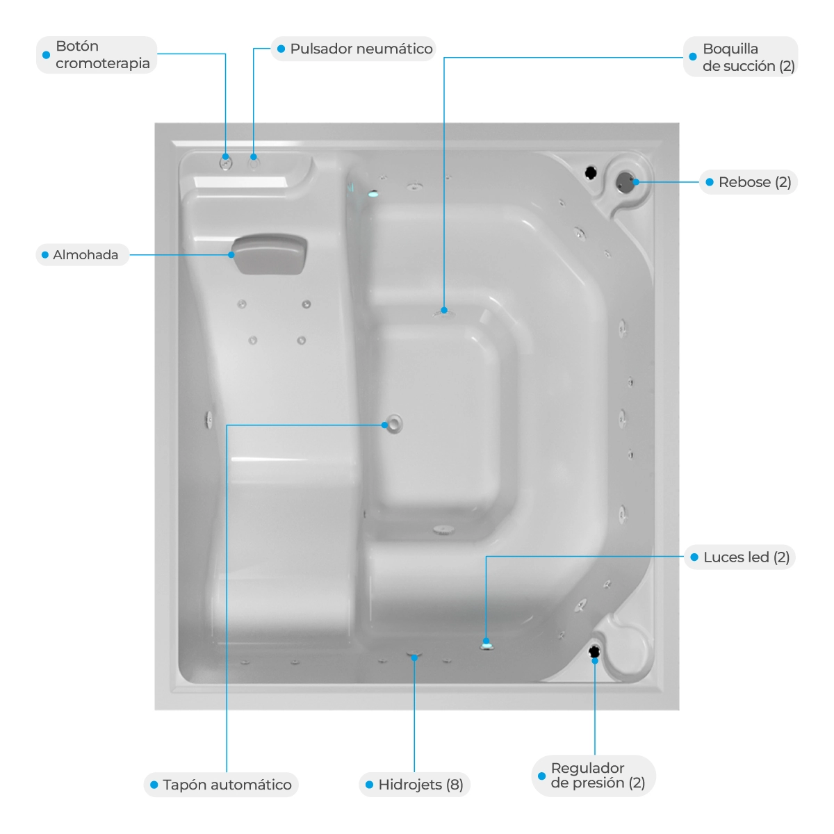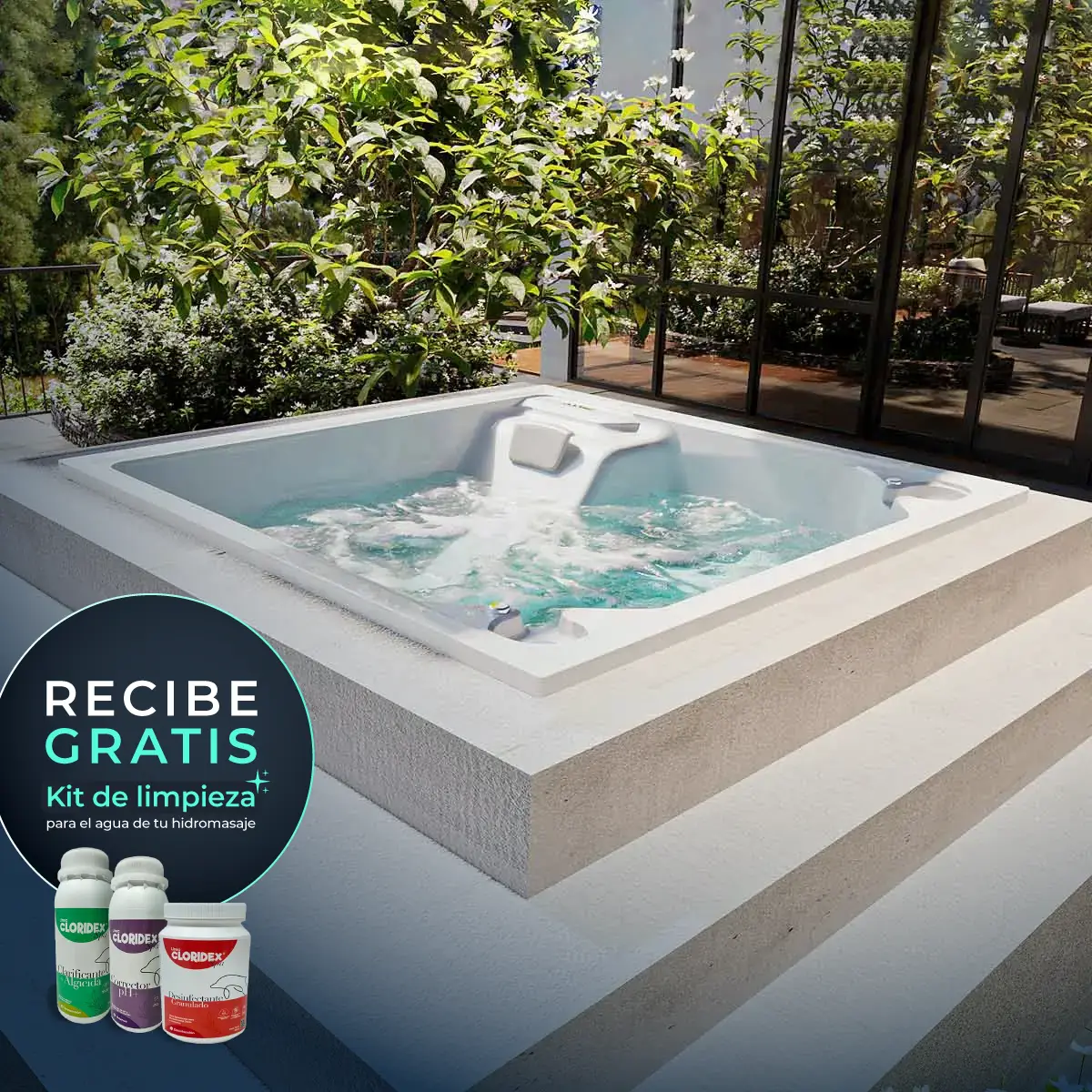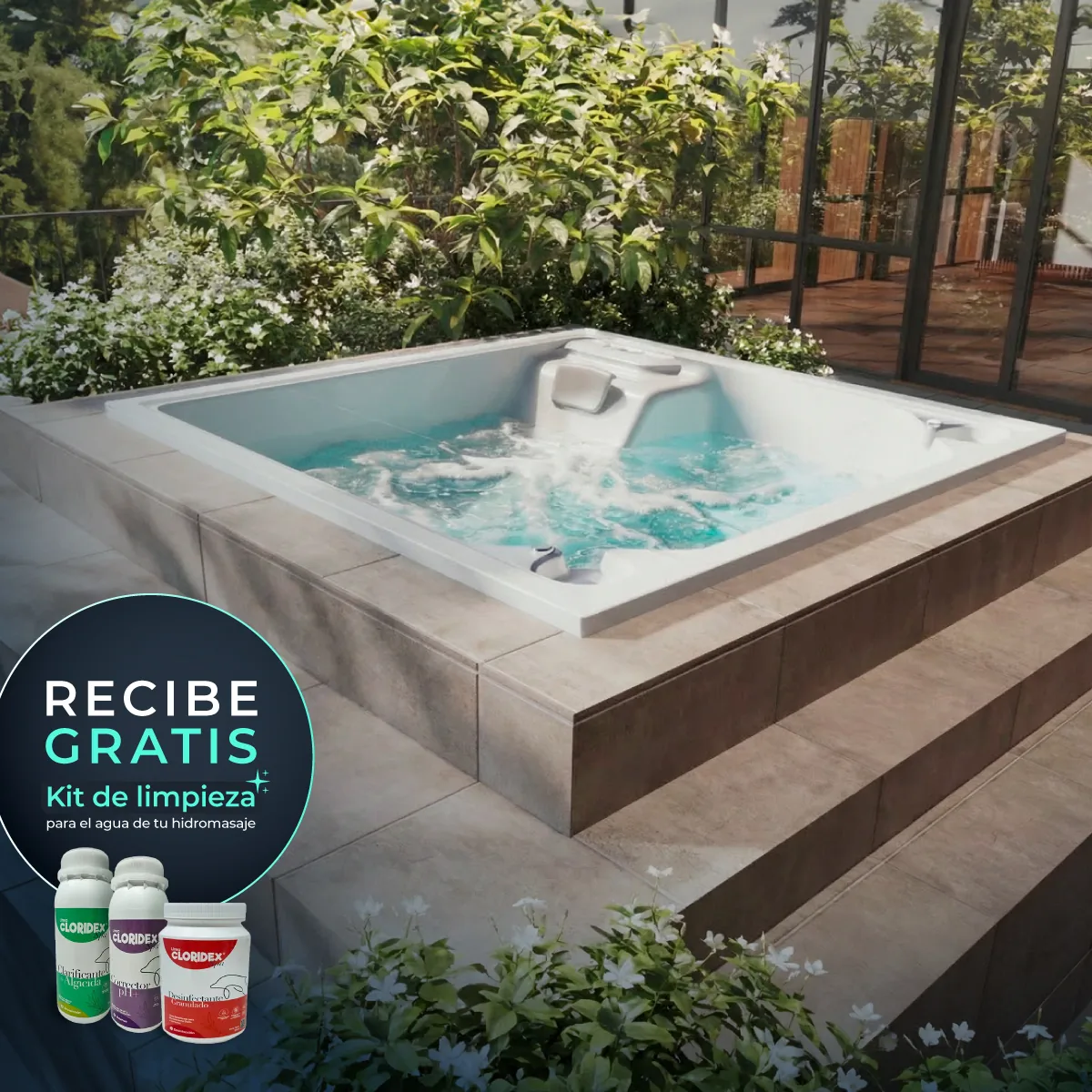 Jacuzzi de empotrar para interior o exterior, ideal para 6 personas, diseño ergonómico con 8 potentes hidrojets y 16 microjets para realizar masajes en las principales zonas musculares del cuerpo. Vive la mejor experiencia de recreación, relajación y descanso con tu Spa en casa. Su diseño permite una fácil instalación sobre mampostería, piedra o madera.