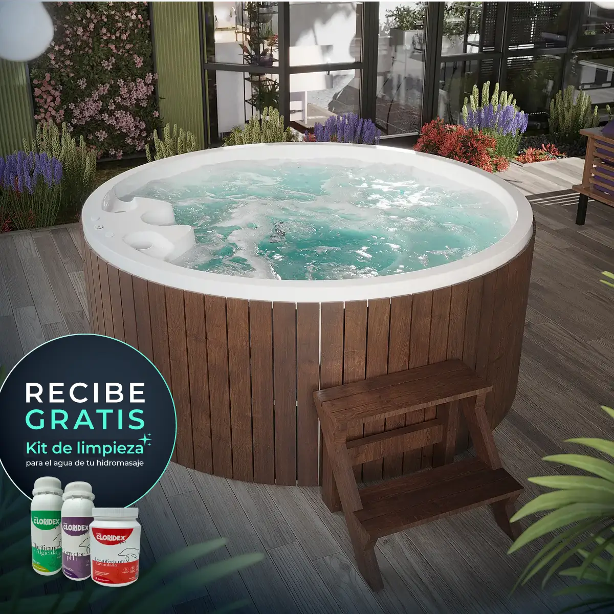 Jacuzzi para interior o exterior, ideal para 5 personas, con un diseño ergonómico y el nuevo deck circular en madera teca. Sus formas suaves y redondeadas abrazan y revitalizan, creando un refugio de calma que invita al descanso y bienestar, favoreciendo la relajación y la conexión entre todos. Equipado con 10 potentes jets que ofrecen masajes en las principales zonas musculares, brindando una experiencia de recreación y descanso inigualable. Disfruta del lujo y confort de tener tu propio spa en casa.