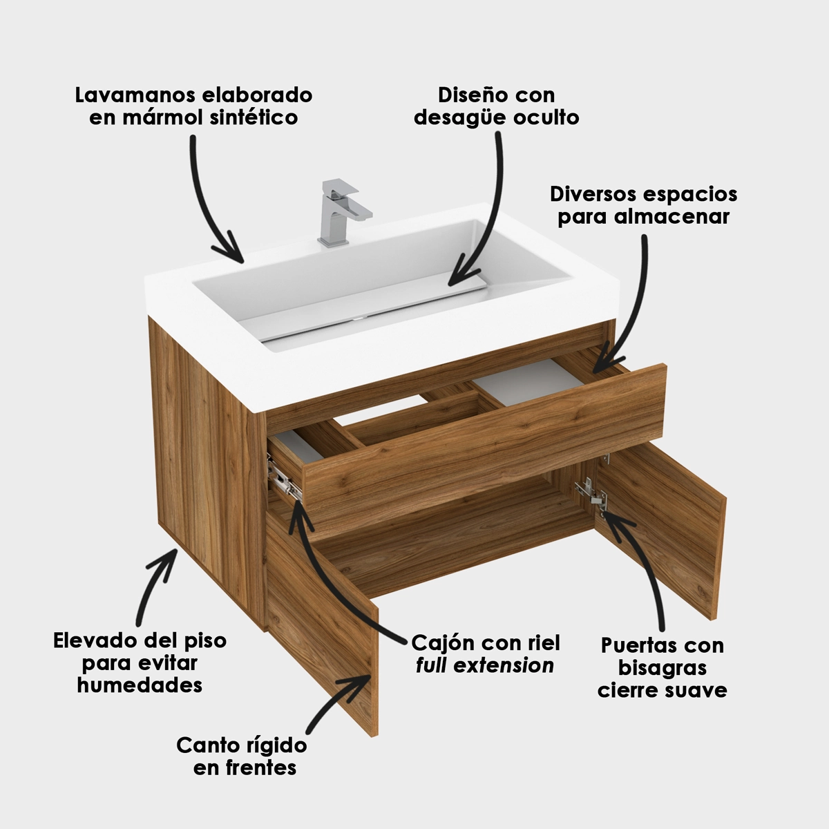 Combinación moderna entre el lavamanos con diseño estético de desagüe oculto. Mueble Macao con amplio espacio de almacenamiento, elegante y fácil de armar, conjunto que evoca estilo y practicidad para su baño.