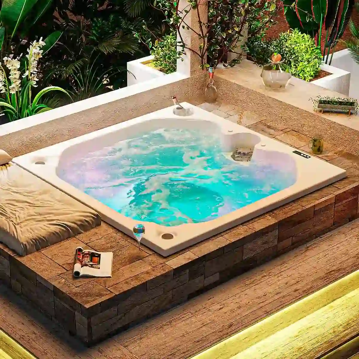 Jacuzzi de empotrar para interior o exterior, ideal para 4 personas, diseño ergonómico con 8 potentes hidrojets y 18 microjets para realizar masajes en las principales zonas musculares del cuerpo. Vive la mejor experiencia de recreación, relajación y descanso con tu Spa en casa. Su diseño permite una fácil instalación sobre mampostería, piedra o madera.