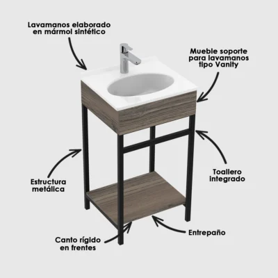 Lavamanos con diseño estético e innovador con mesón integrado, aportando una apariencia fresca y moderna, en combinación con mueble Vitelli Class de diseño vanguardista de dos puertas y dos cajones, combinación moderna que evoca estilo y practicidad para su baño.